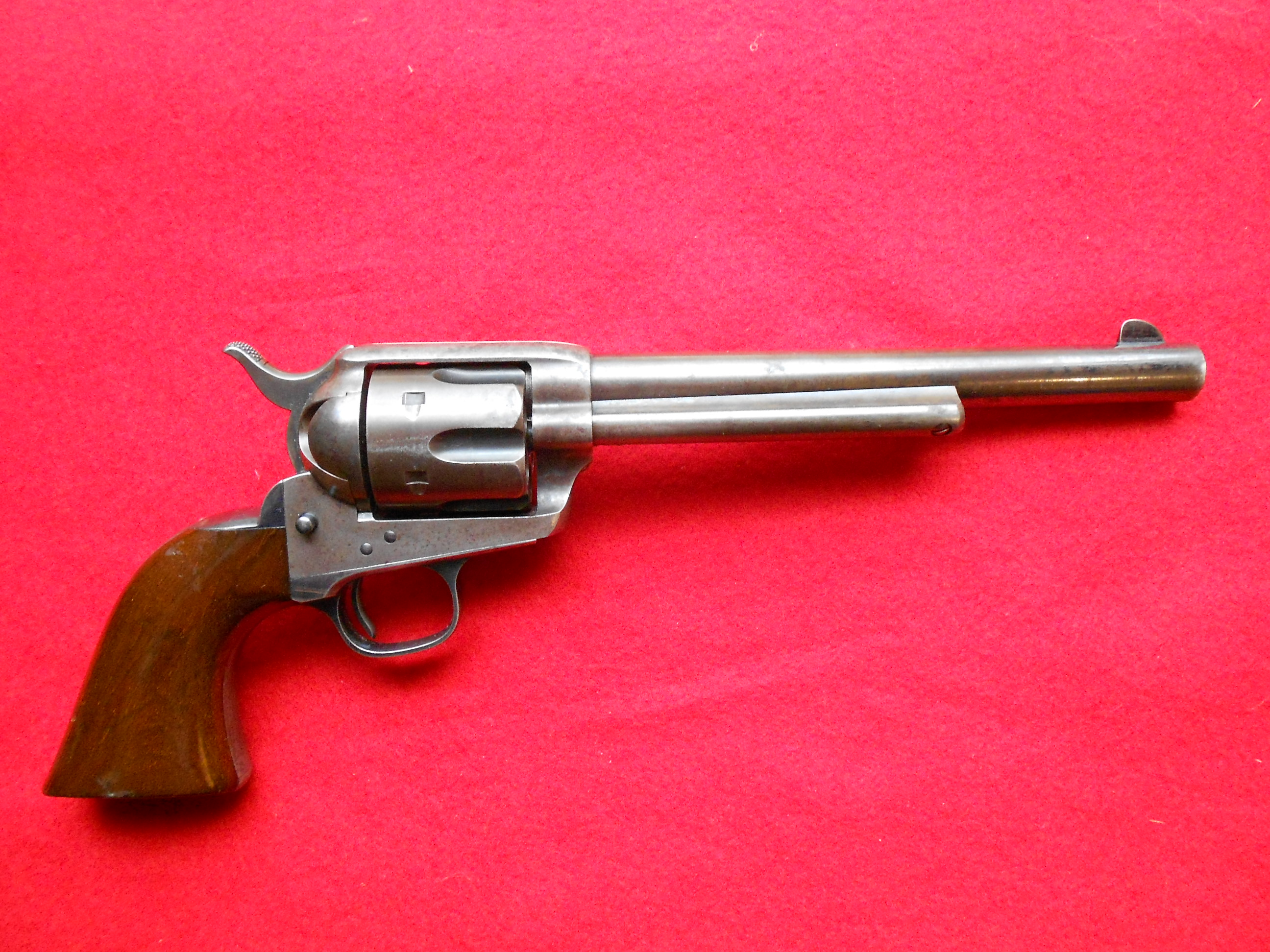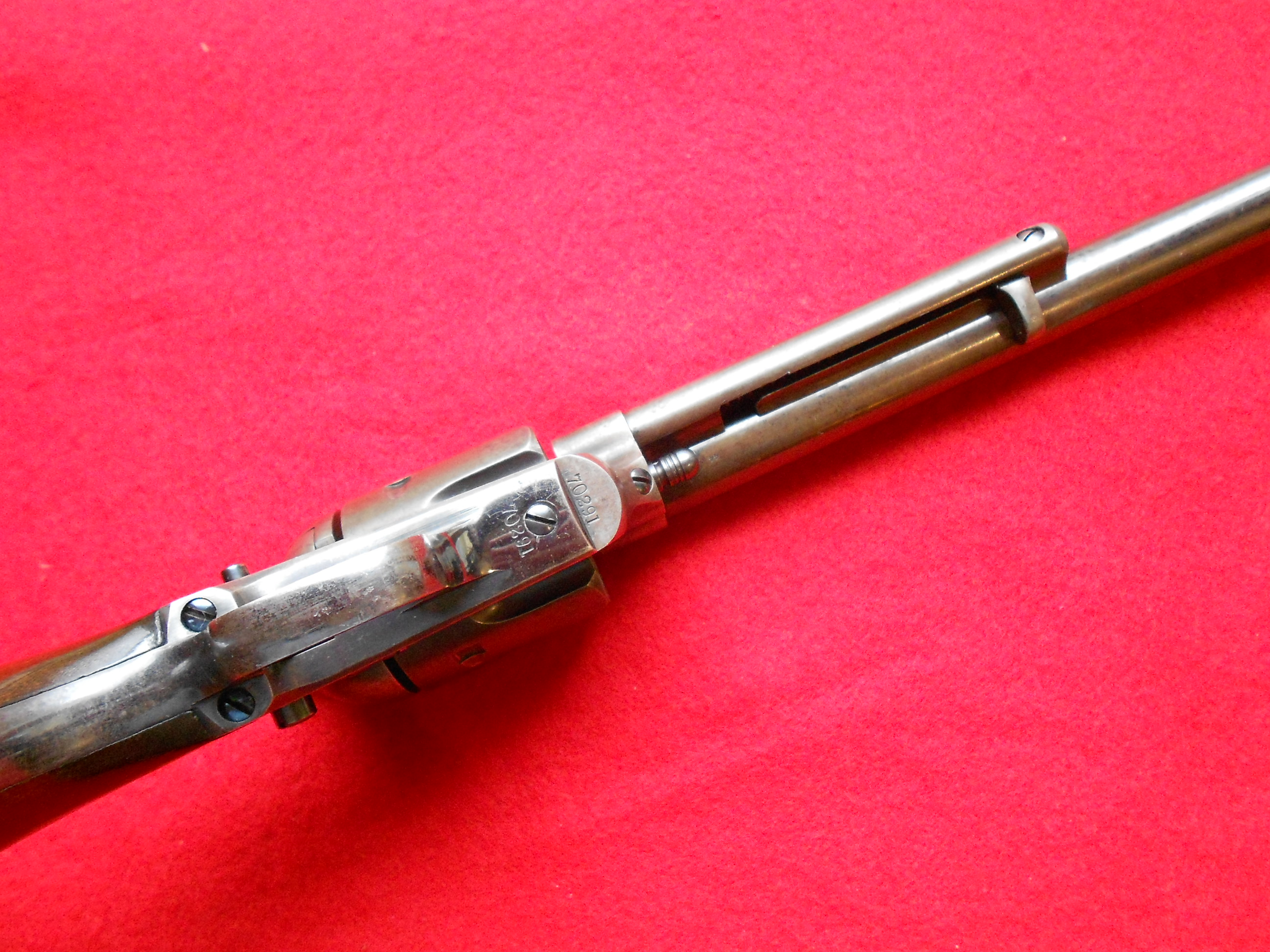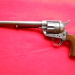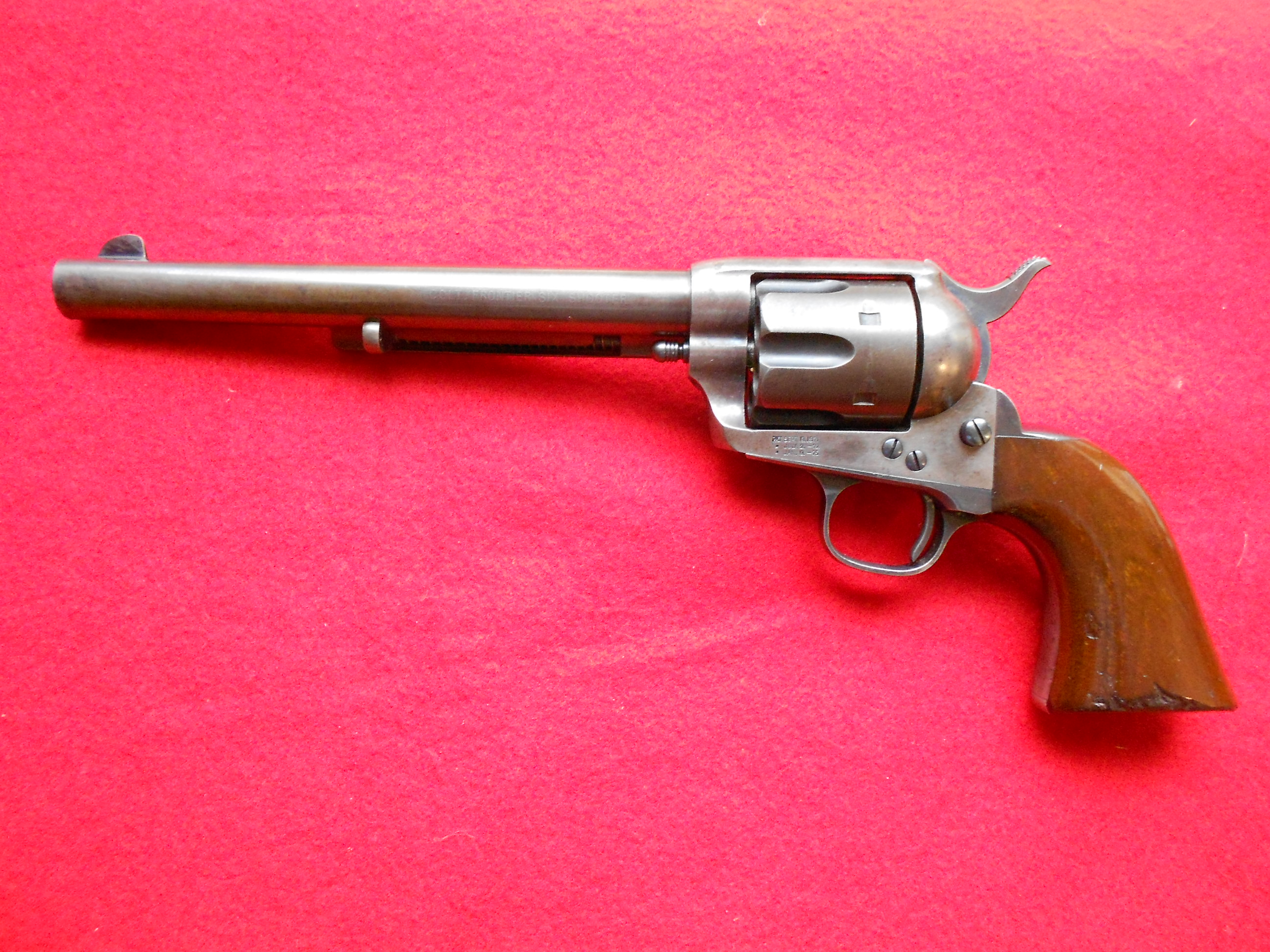 Wonderfully legible etched “Colt Frontier Six Shooter”, difficult to find in an early blue gun shipped 8-23-1881 the year of the Gunfight at the OK Corral and Billy the Kid’s death, and while the remaining 90% blue and case colors are amazing, perhaps more so is the 90% original varnish remaining on the wooden walnut grips. Comes with factory letter dated 2008, $24,000