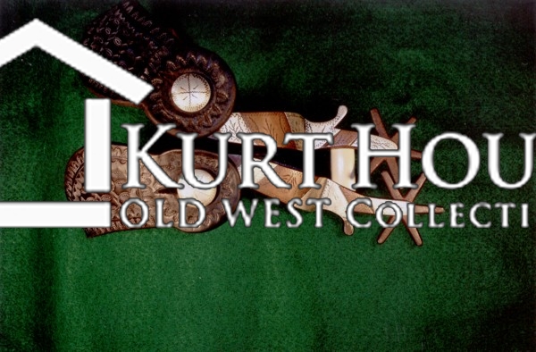 Crockett ‘Del Rio” (Texas) pattern spurs, scarce pattern very desirable & difficult for even Crockett specialists, alternating bands in mountings of silver & copper, nice original straps, 2 holes in heel bands ( see photo 7b) for heel chains, probably removed by former owner, easily replaceable, great engraving and condition. $ 3850