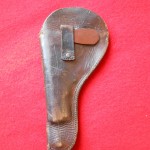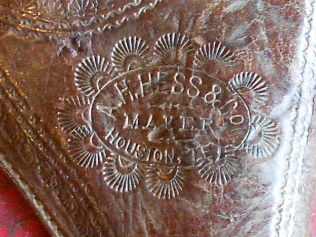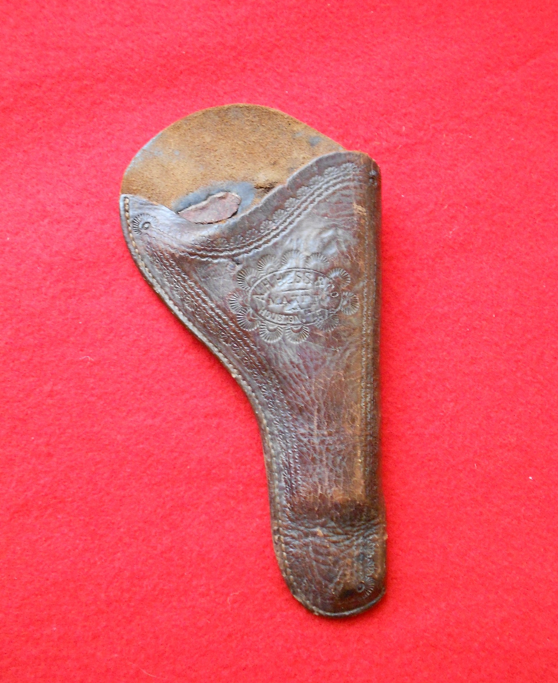 A. Hess holster, Houston, Texas, for 4 ½” Colt DA 1877 “Lightning or Thunderer” Model, great mark on front of pouch, small hole that has been repaired from back as can be seen in photo, circa 1900. $795