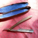 Razor attributed to W. H. Antrim, the father of Billy the Kid, with provenance letter from Albuquerque, N. M. antique store, discovered about 1995, with affidavit from previous owner, horn handle is crudely scratched “W.H. Antrim”, in mangled original steel case. $2500