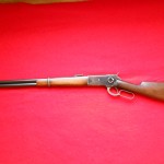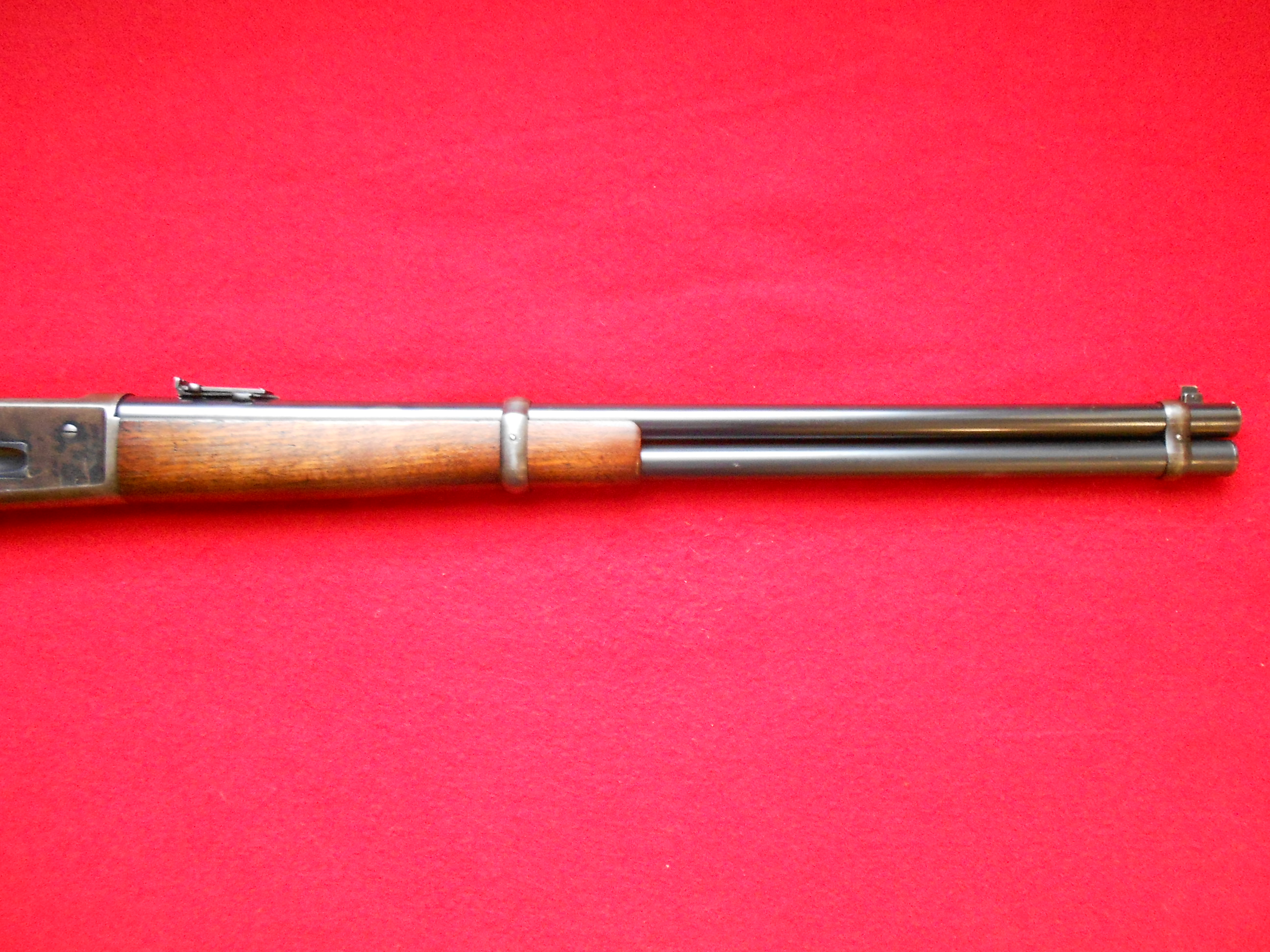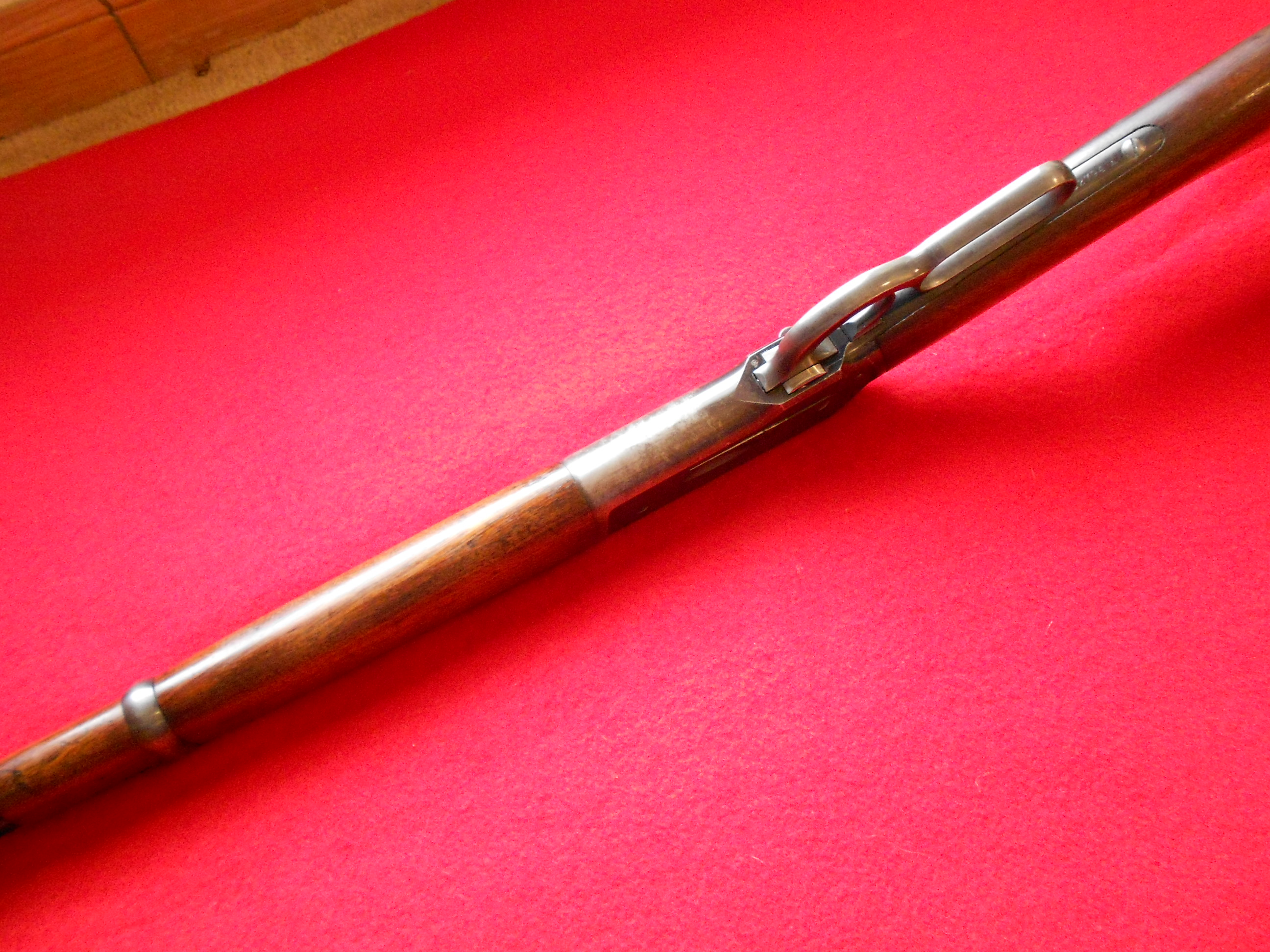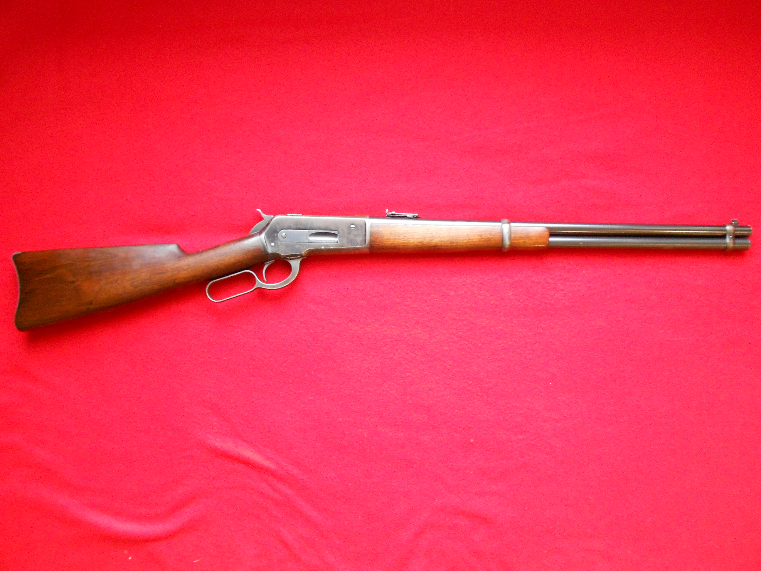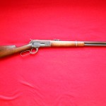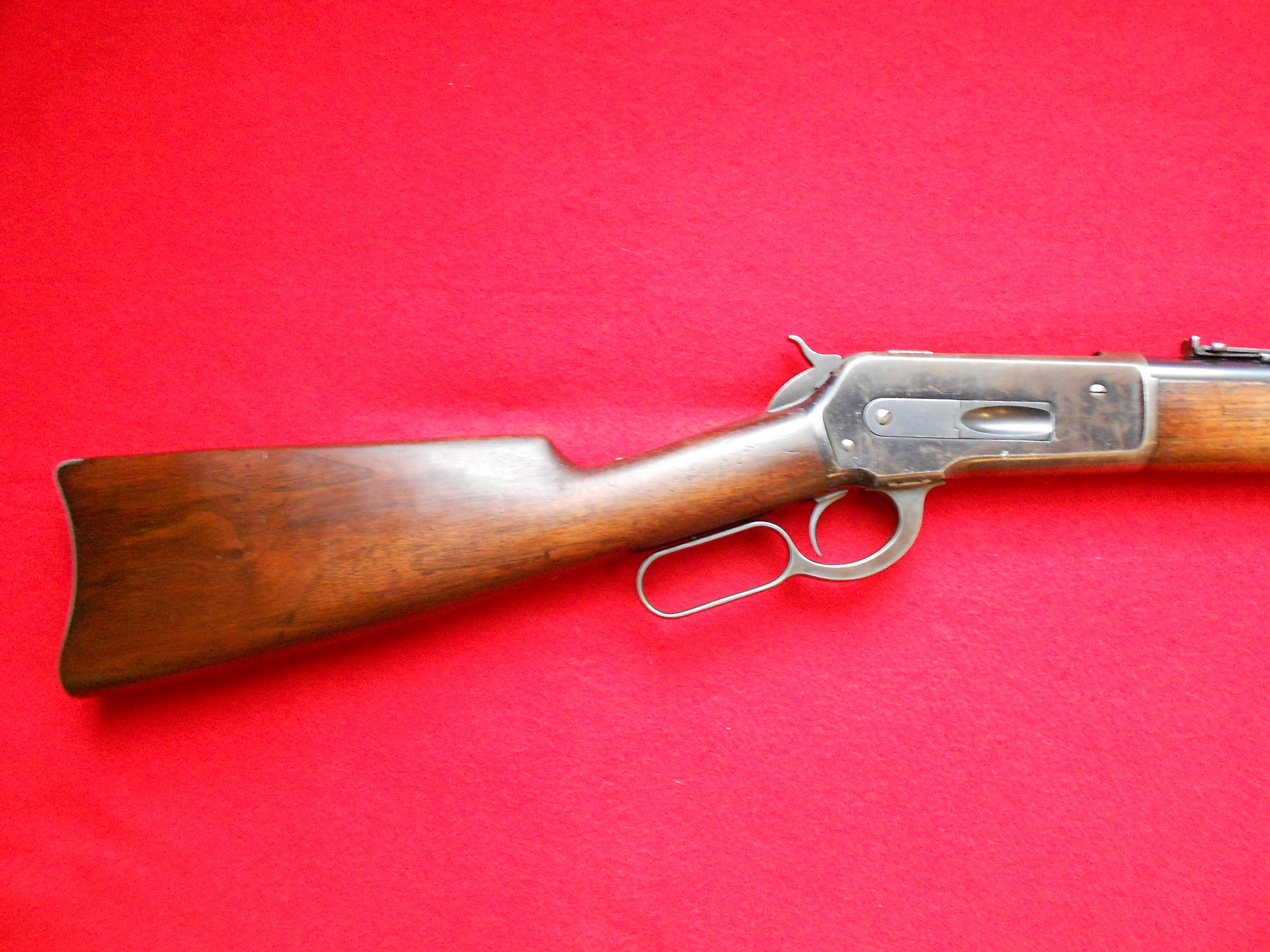 Winchester 1886 Saddle Ring Carbine, .45-70 caliber, standard nice gun with about 80% original blue finish, is later gun so with blue receiver, circa 1912, serial # 152,794. Has small un-noticeable ¼”wood patch on muzzle side of ring, otherwise an almost perfect gun. $16,000