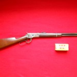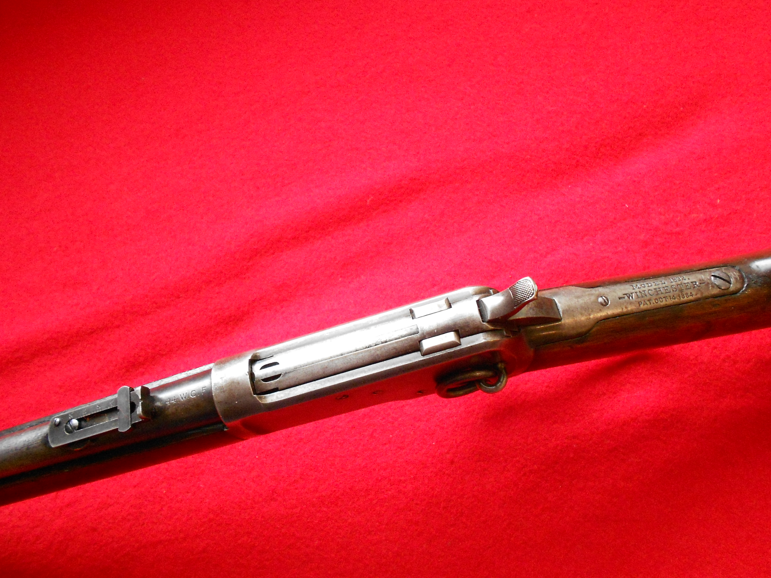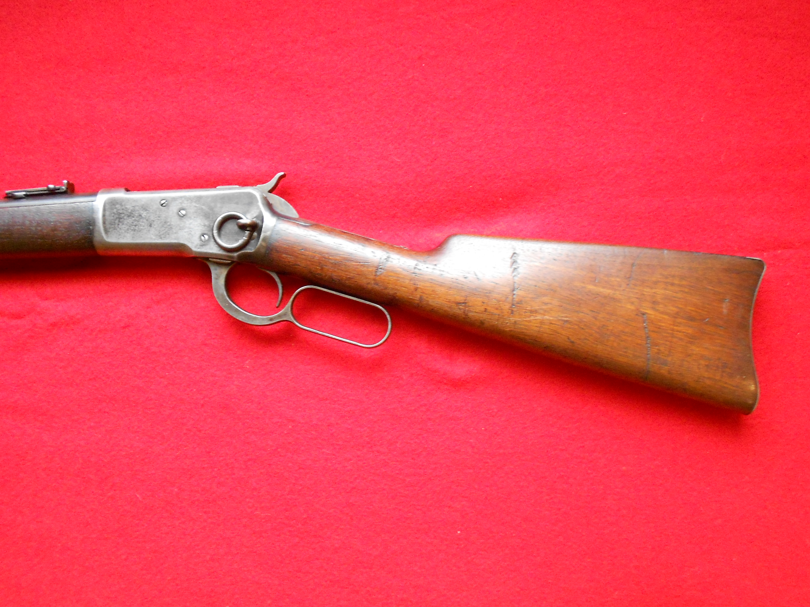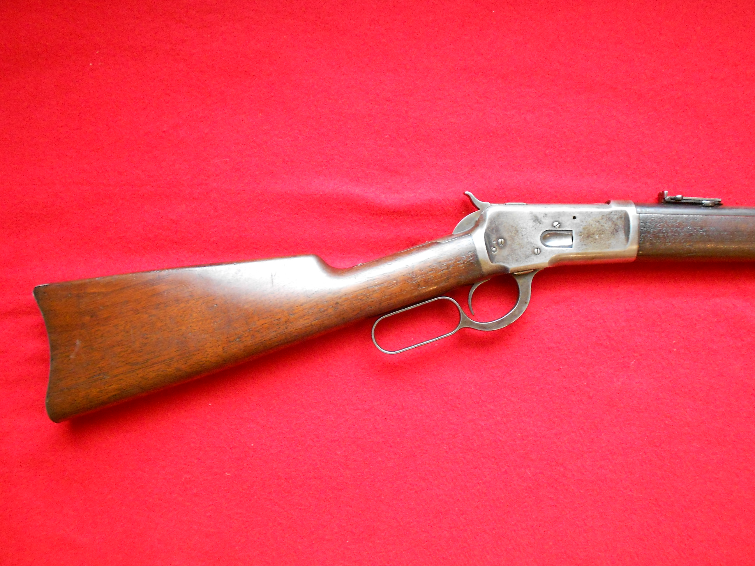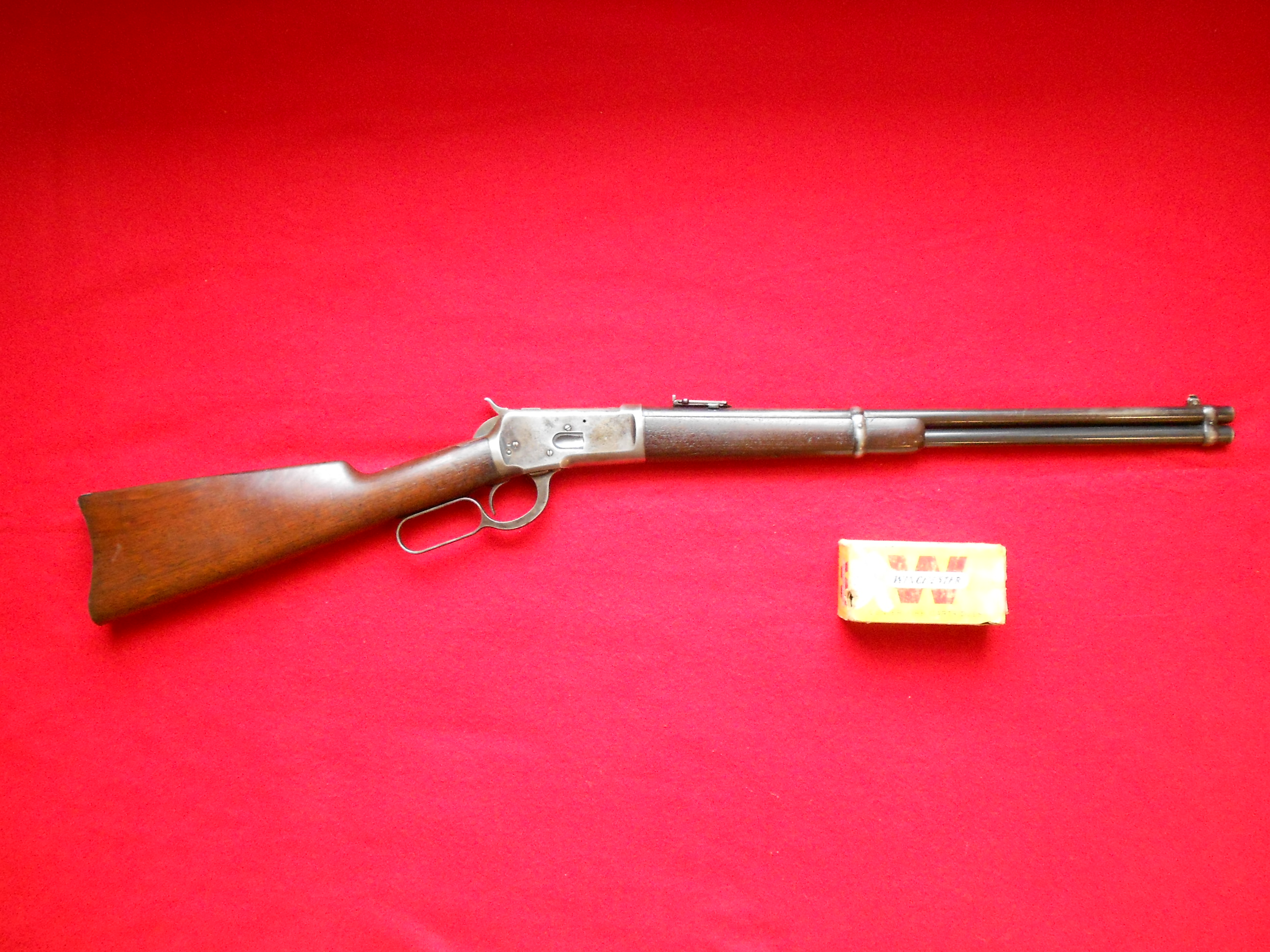 Winchester 1892 Saddle Ring Carbine, desirable .44-40 caliber, not much finish left on receiver, about 50% on barrel, serial #214,085 for 1903 , with an almost full box of cartridges, a good shooter and companion to a Colt Single Action in the same caliber. $3995